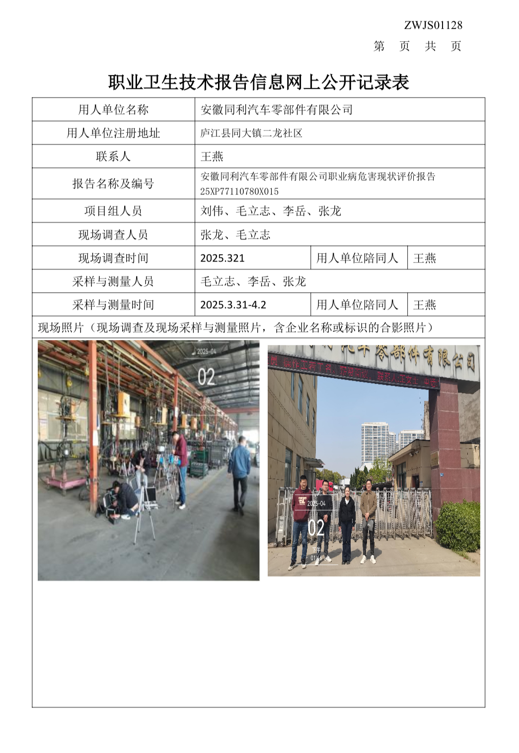 安徽同利汽車零部件有限公司職業(yè)病危害現(xiàn)狀評價報告