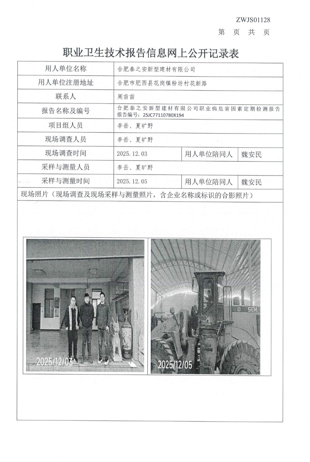合肥泰之安新型建材有限公司職業病危害因素定期檢測報告