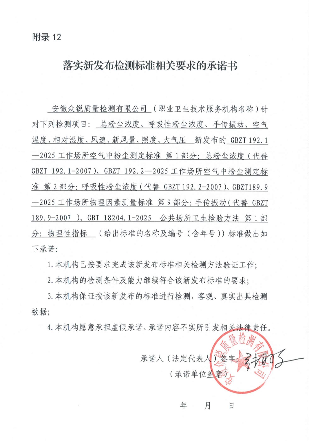 落實新發布檢測標準相關要求的承諾書